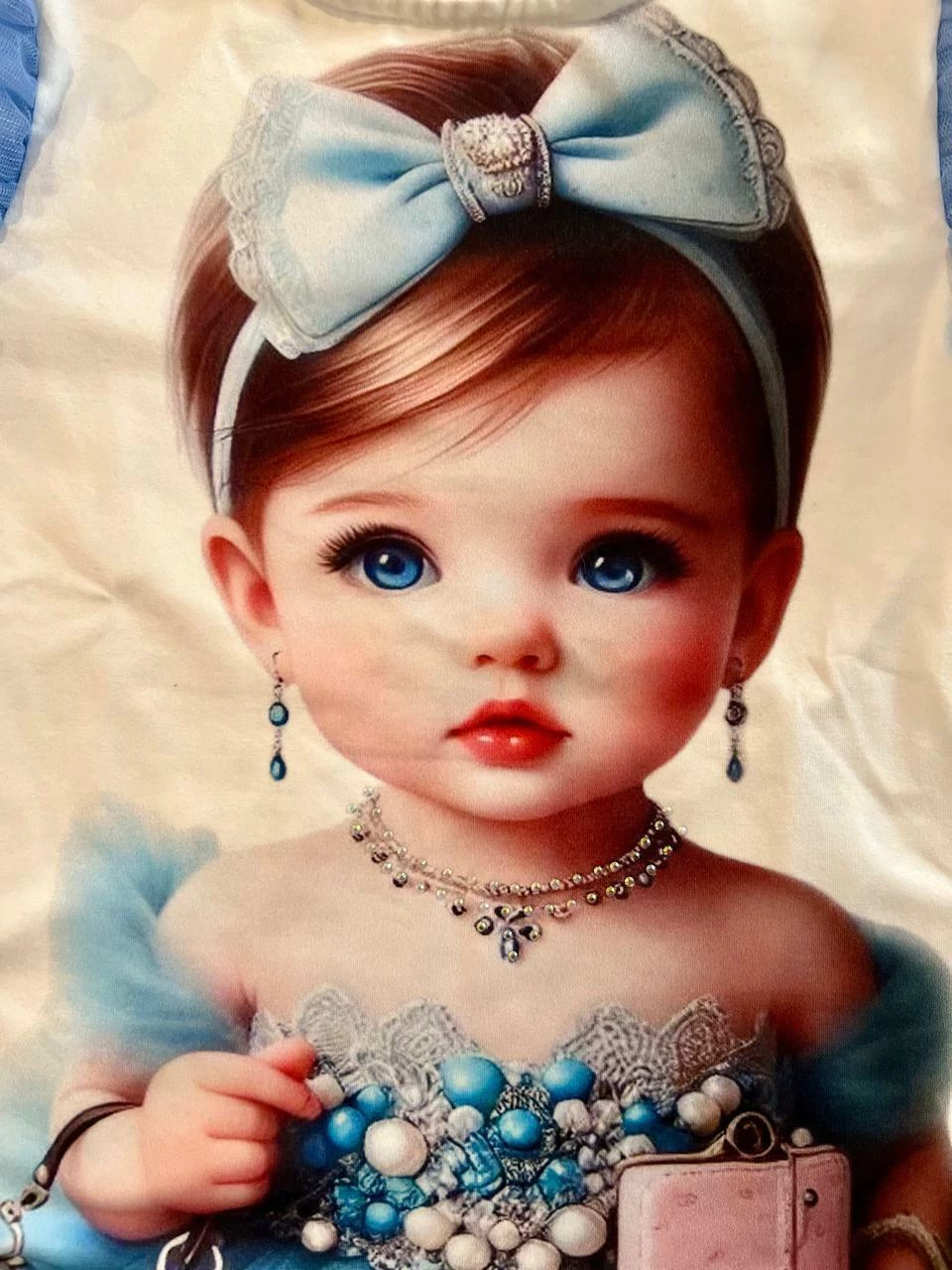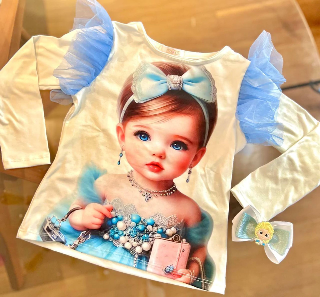 Feita em malha de alta qualidade, ela apresenta uma delicada estampa de menina que traz um toque de romantismo e riqueza de detalhes. Os detalhes em tule na cor azul celeste deixam a peça ainda mais charmosa e cheia de delicadeza.