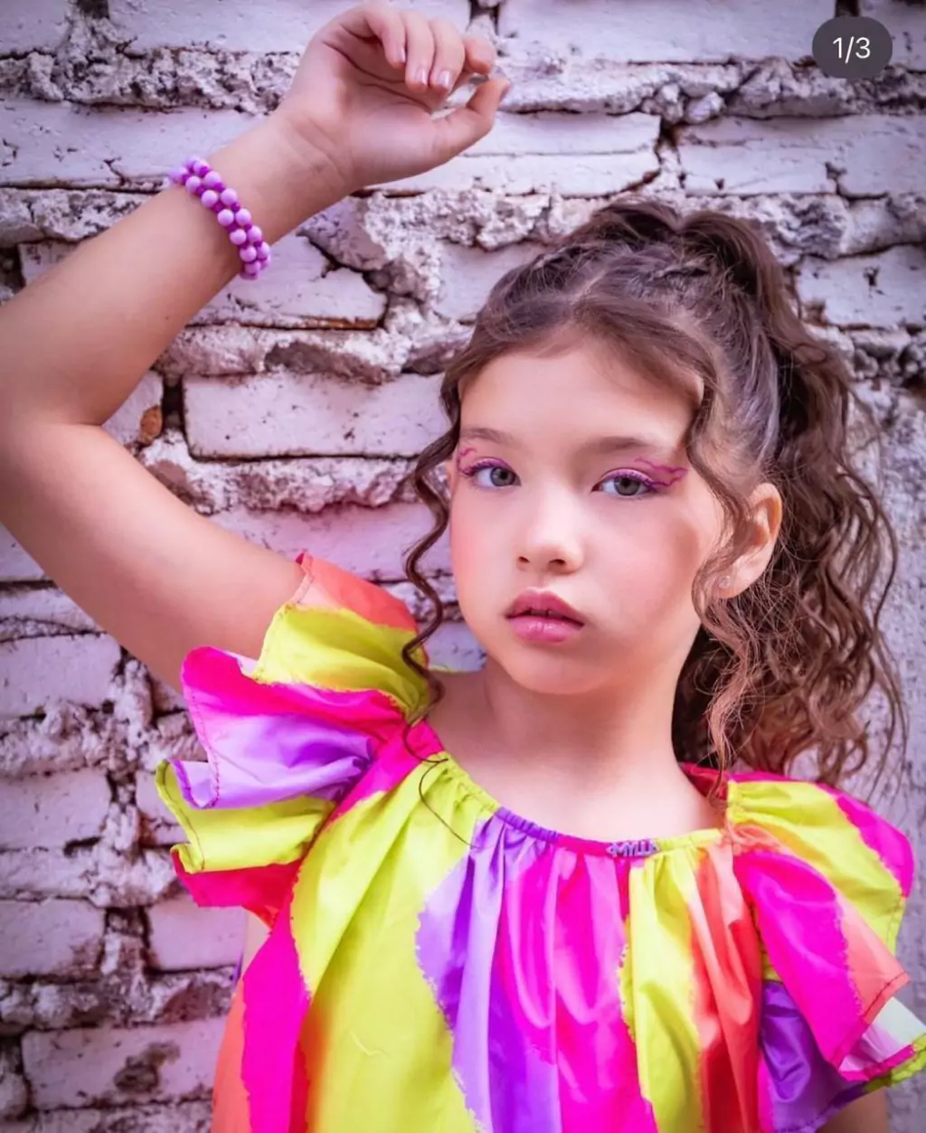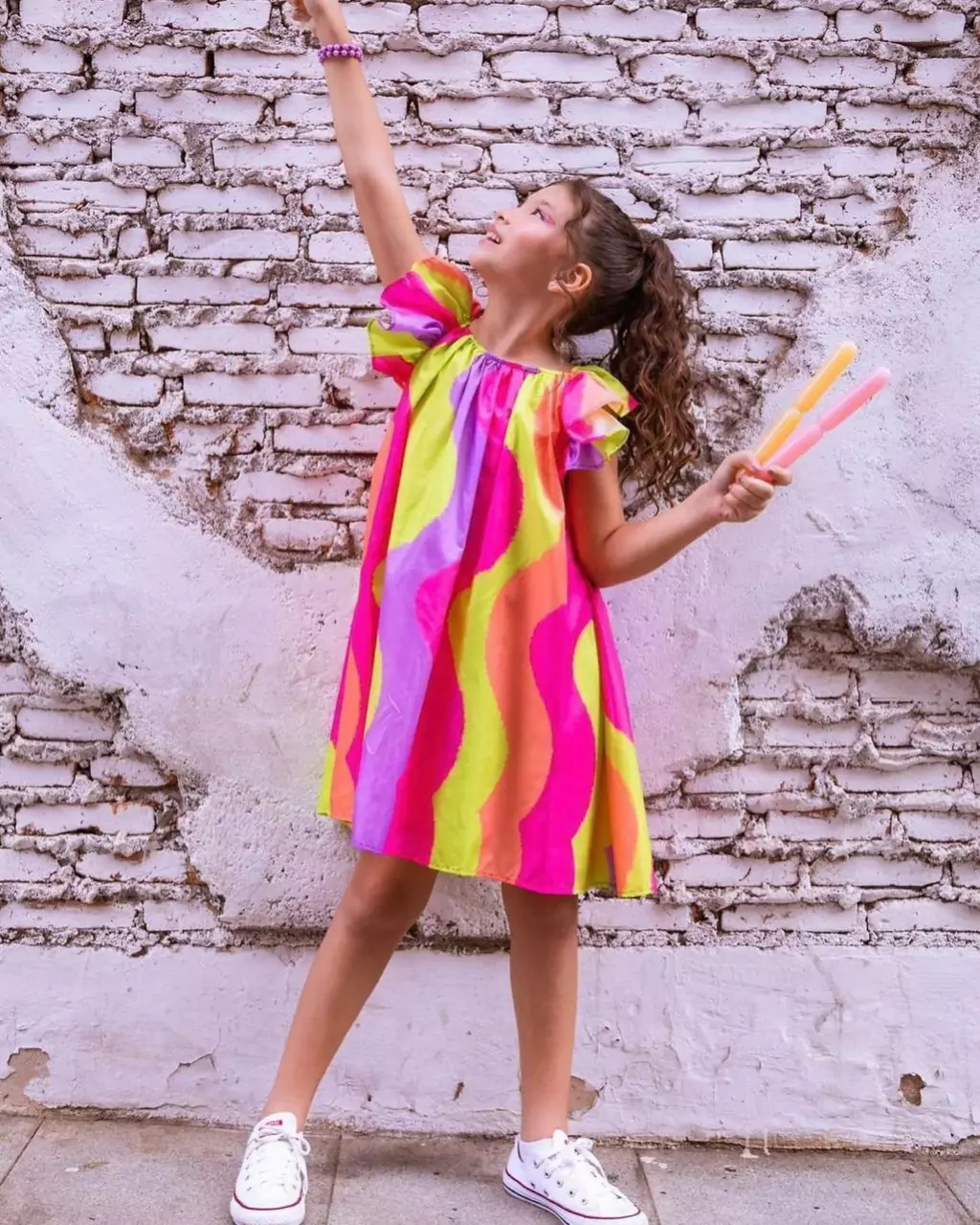 Vestido arco- íris em cores vibrantes, em tecido sintético.